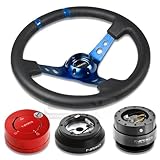 NRG-SRK-140H+200GM+101RD+016RBL, NRG Innovations 13.78" 350mm 3" Deep Dish Style Black Leather Blue Center Marking Blue Spokes Racing Steering Wheel Combo with 6 Hole Short Hub Adapter with Gen 2.0 Gun Metal Quick Release with Red Lock Hub Kit SRK-140H